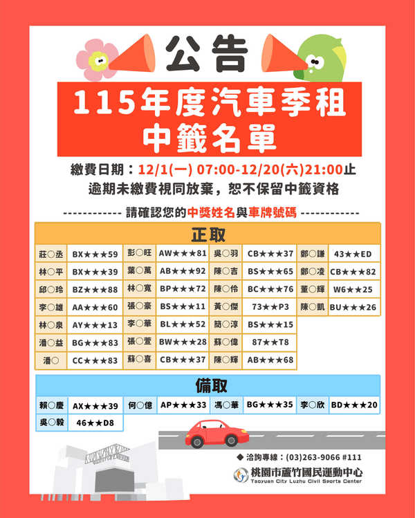 蘆竹國民運動中心,【115年汽車季租中籤名單】